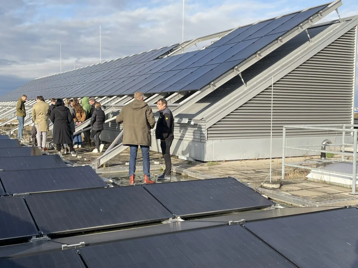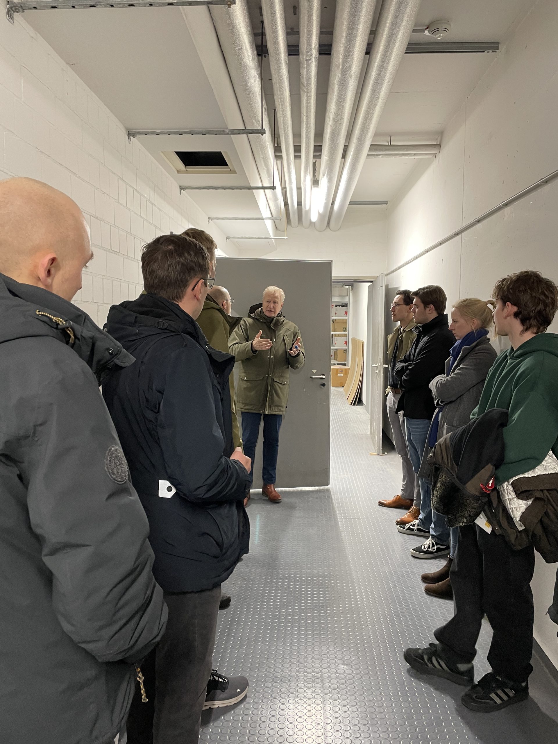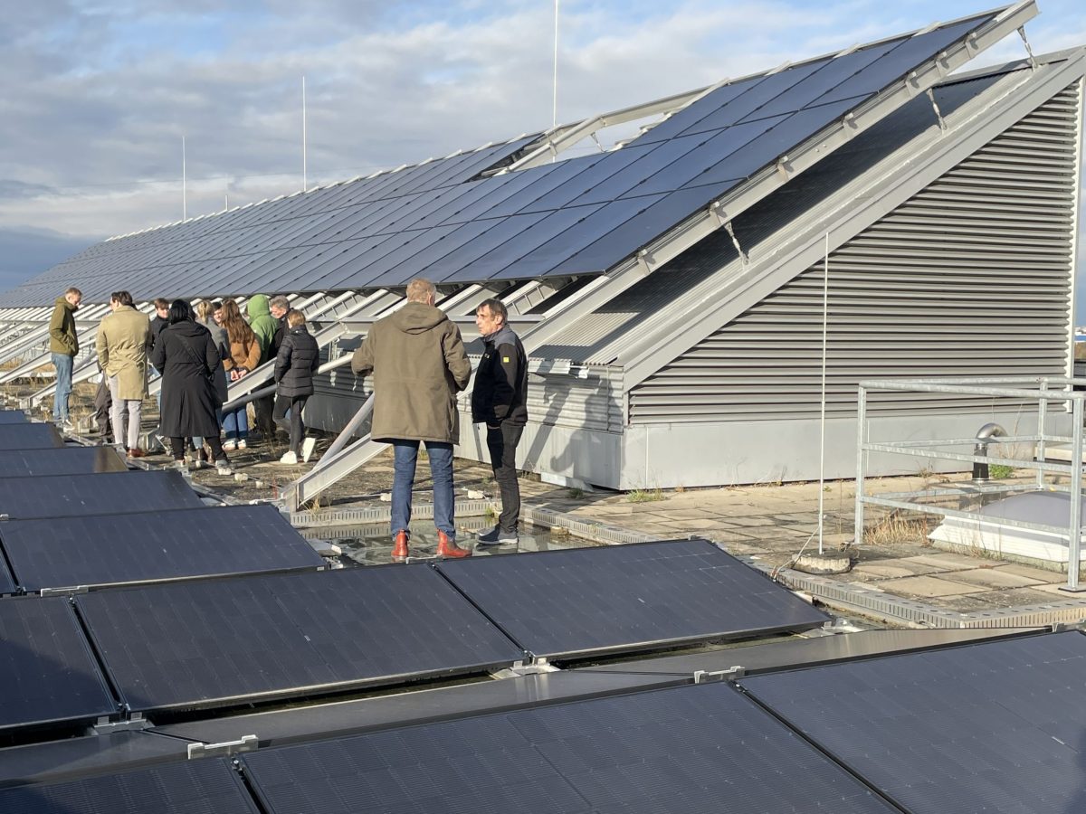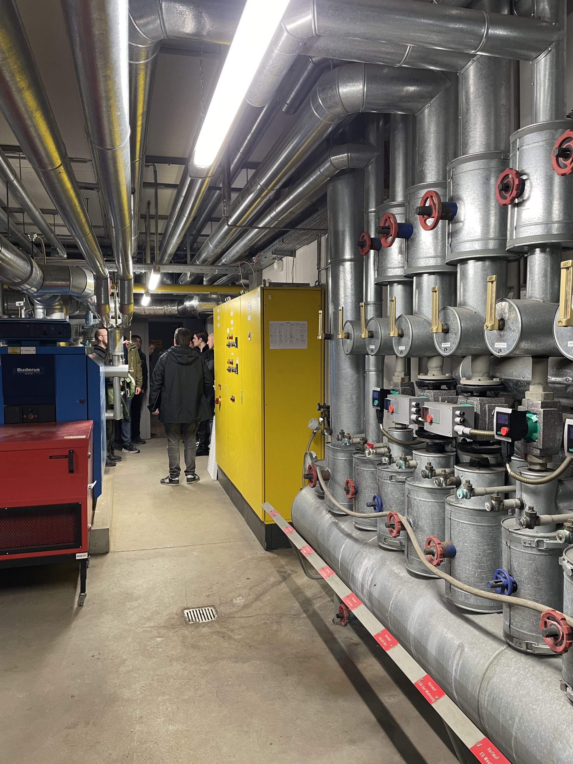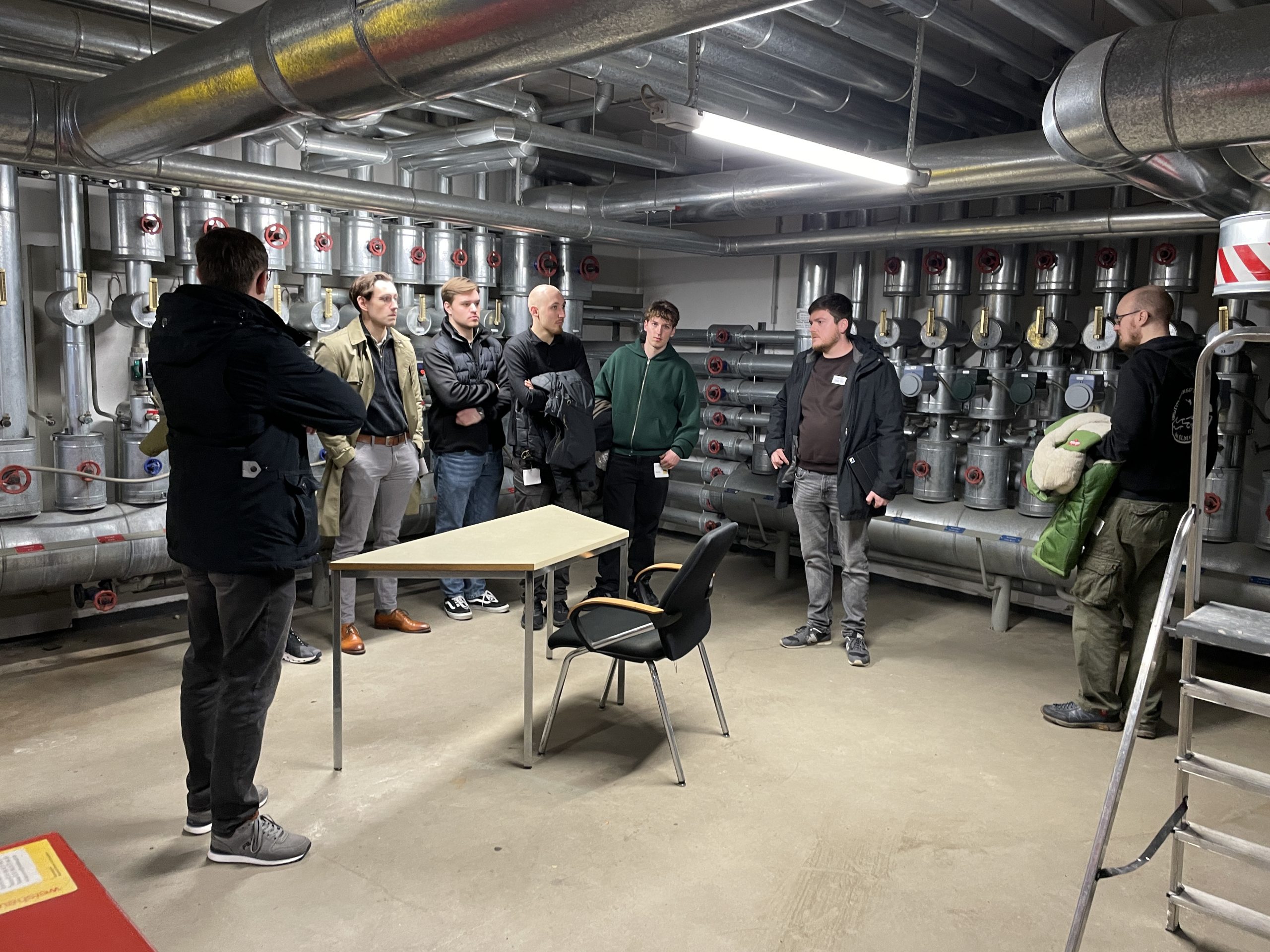 Während der anschließenden Begehung konnten die Studierenden verschiedene Bereiche des Gebäudes besichtigen – darunter die Innenräume, das Dach mit der PV-Anlage, das Außengelände mit den Wärmepumpen sowie die Technikzentrale, in der wesentliche Elemente der neuen Energietechnik zusammenlaufen.