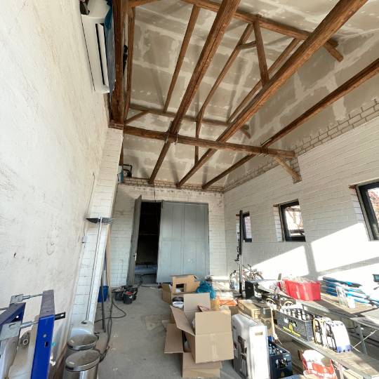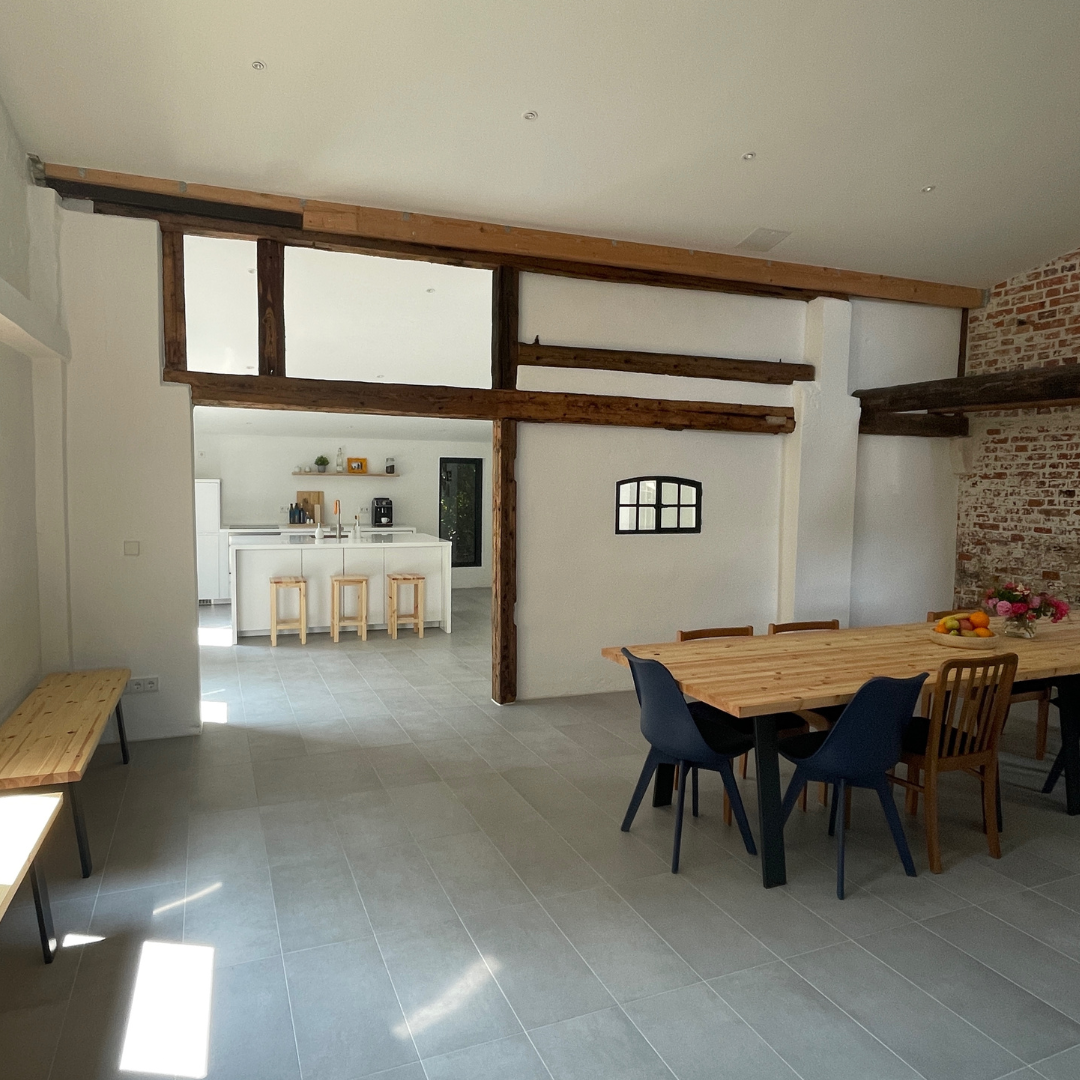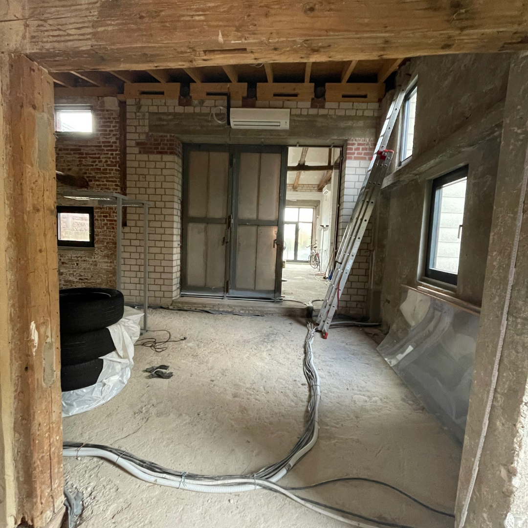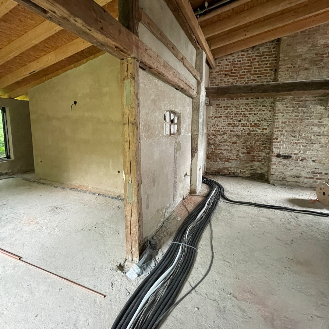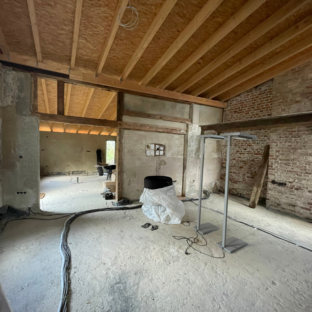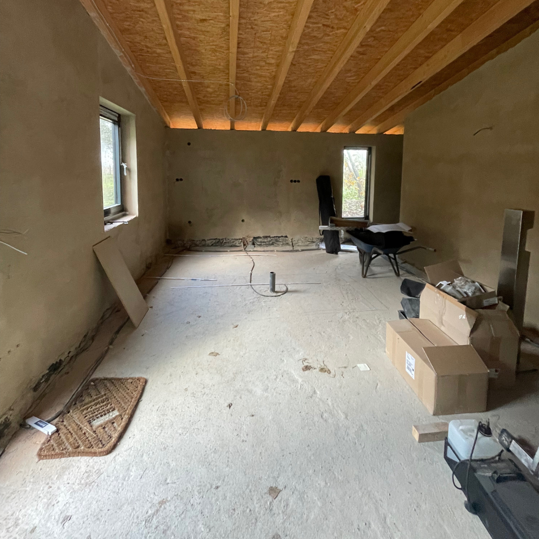 Im Juli widmeten wir uns den vielen wichtigen Details des Innenausbaus. Die Decken wurden gedämmt und mit Trockenbau verkleidet. Zudem fanden auf der Baustelle die ersten Gespräche mit unserem Maler statt, um den künftigen Anstrich abzustimmen. Eine Besonderheit stellten die neu errichteten hinteren Räume dar, die mit Lehmzement aufgebaut wurden. Daher war es entscheidend, eine Farbe zu wählen, die – ebenso wie der Lehmzement – diffusionsoffen ist, um das Raumklima positiv zu unterstützen und die Atmungsaktivität der Wände zu erhalten.