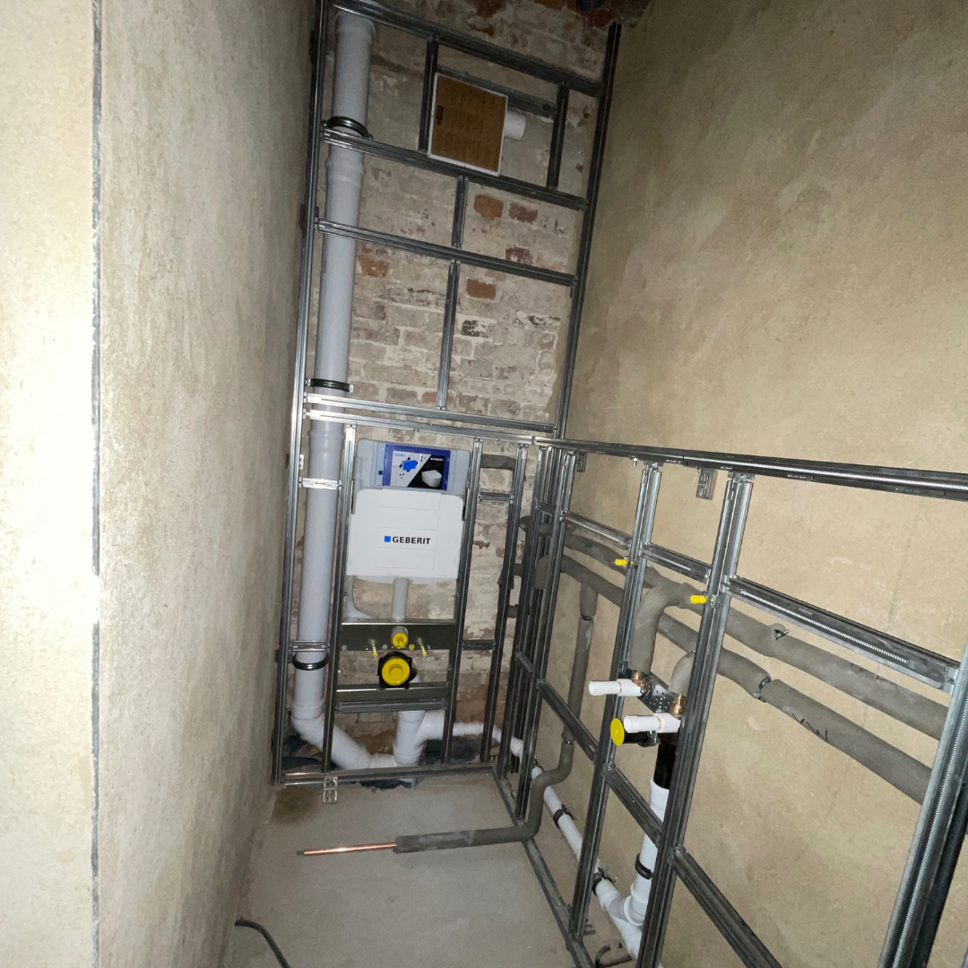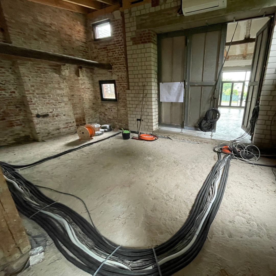 Im April und Mai wurden als erste Baumaßnahme Daten- und Stromkabel sowie Versorgungsleitungen verlegt. In den WCs wurden die Vorwände aufgebaut und die Anschlüsse gesetzt. Zudem wurde der Boden im vorderen Raum mit Epoxidharz versiegelt, um das Aufsteigen von Feuchtigkeit zu verhindern und das später verlegte Holz dauerhaft zu schützen.